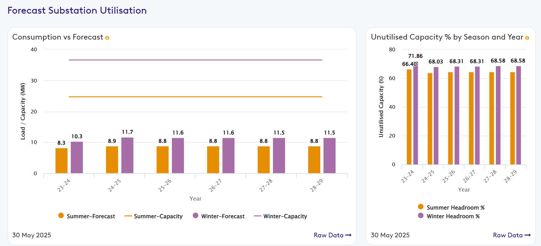 Our open data (Data centre utilisation, Data centre demand profiles) shows that even the largest data centres are currently only using between 20% - 40% of their maximum import capacity.