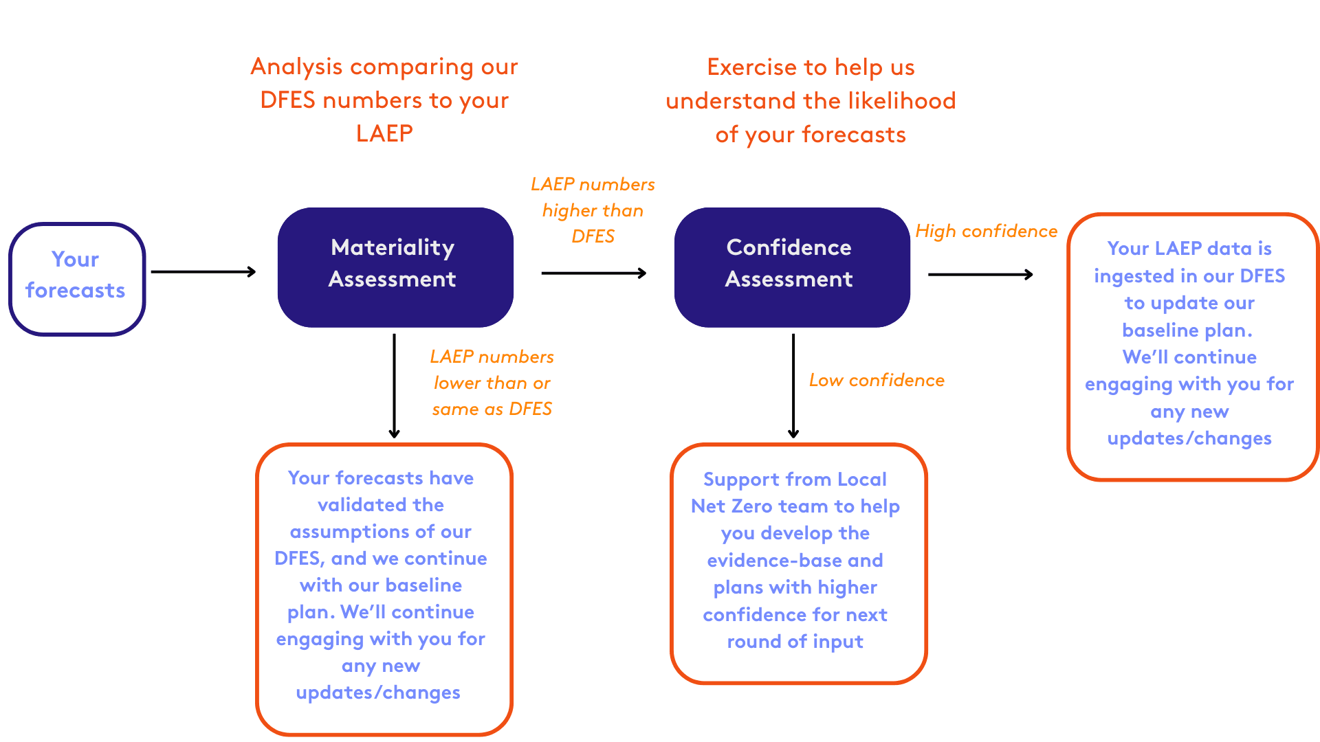 Under the LAEP Support Framework, we carry out a confidence assessment whenever the local authority forecast is higher than our DFES Holistic Transition scenario, the scenario we use to plan our network investment. The goal of the Confidence Assessment is to understand how likely these local forecasts are to materialise.